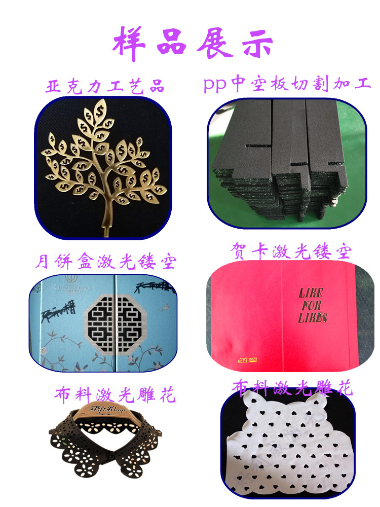 本公司專業(yè)對外加工布料切割加工、無紡布毛氈激光鏤空 皮革激光加工、服裝布料激光雕花、麂皮絨激光切割、亞克力,竹木盒月餅盒激光加工,皮革激光雕花等。激光沖孔切割不發(fā)黑不發(fā)黃不發(fā)臭無黑灰”受到眾多客戶認可歡迎打樣咨詢。